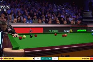 比赛第21局,塞尔比打丢简单球后怒砸球杆,吴宜泽上手拿下本局,率先进入赛点局。